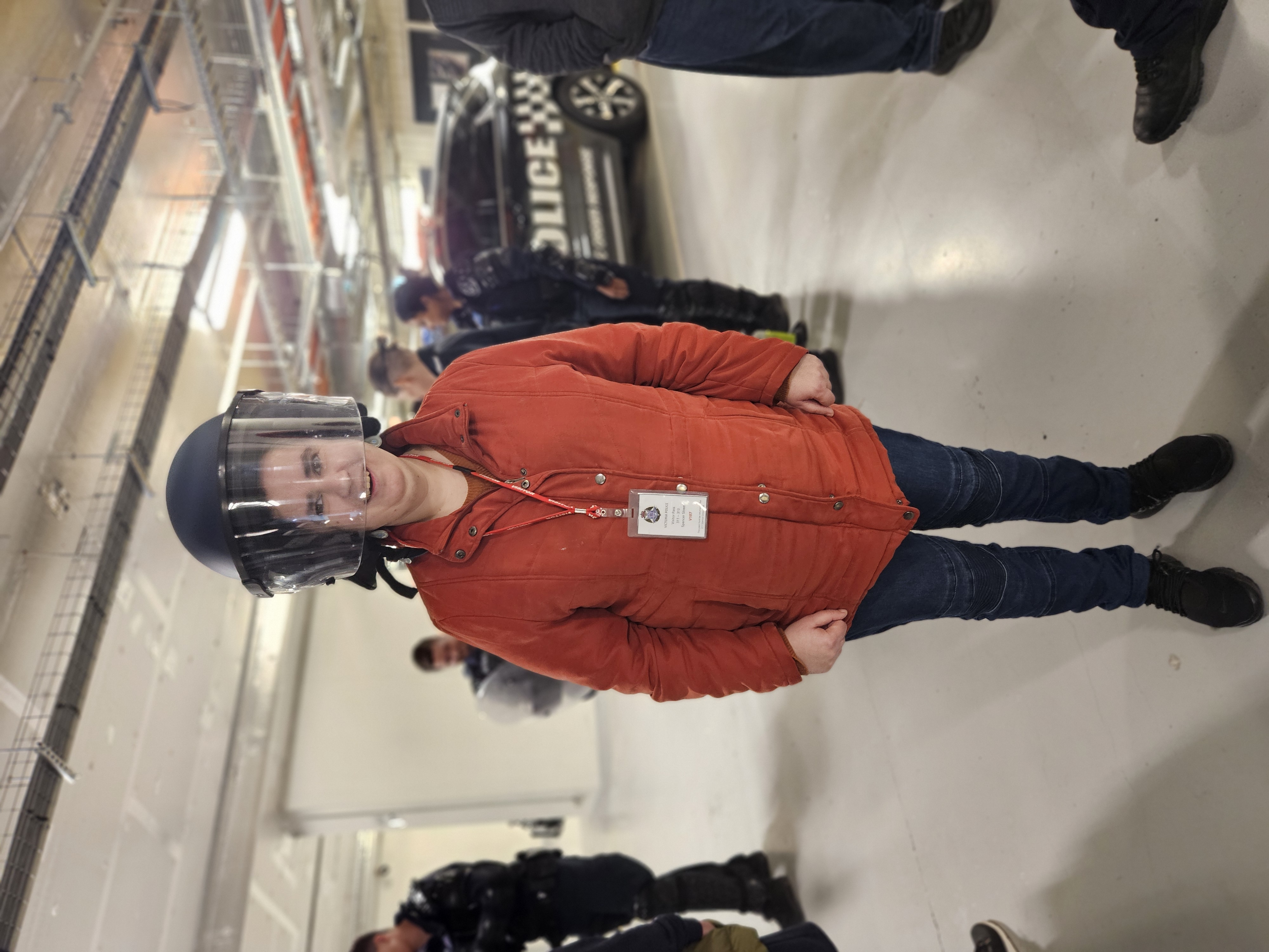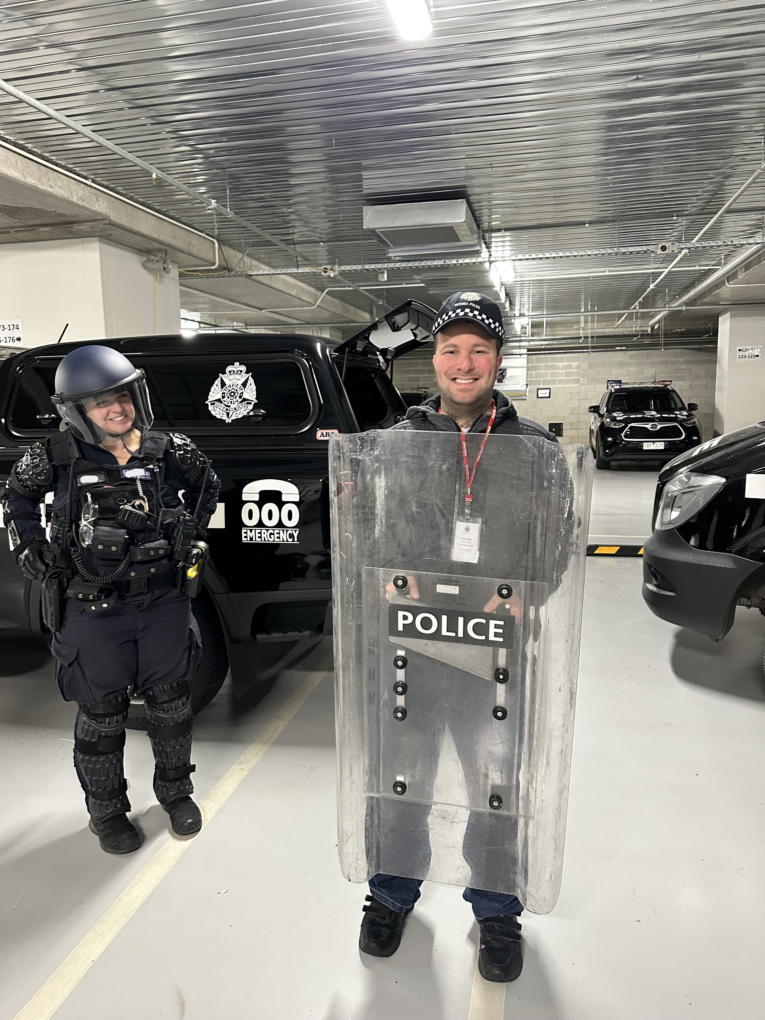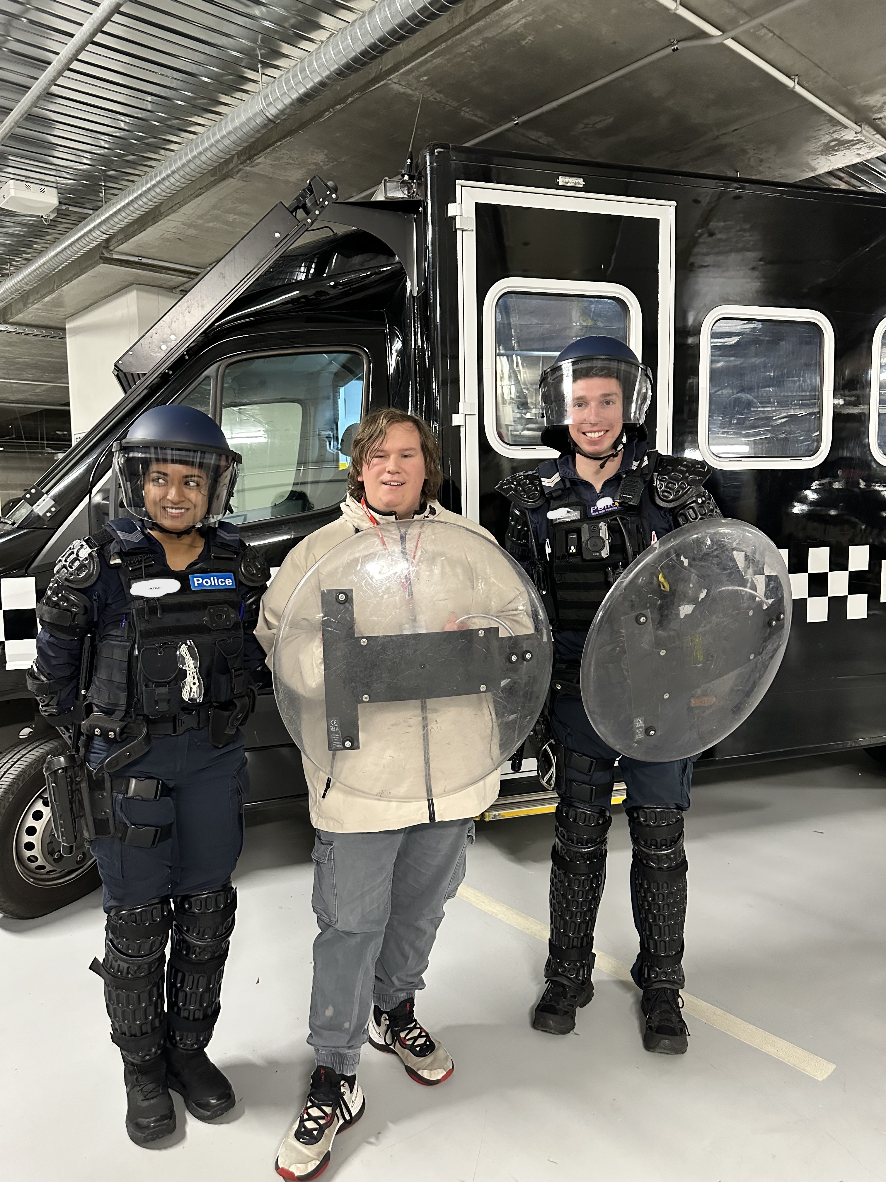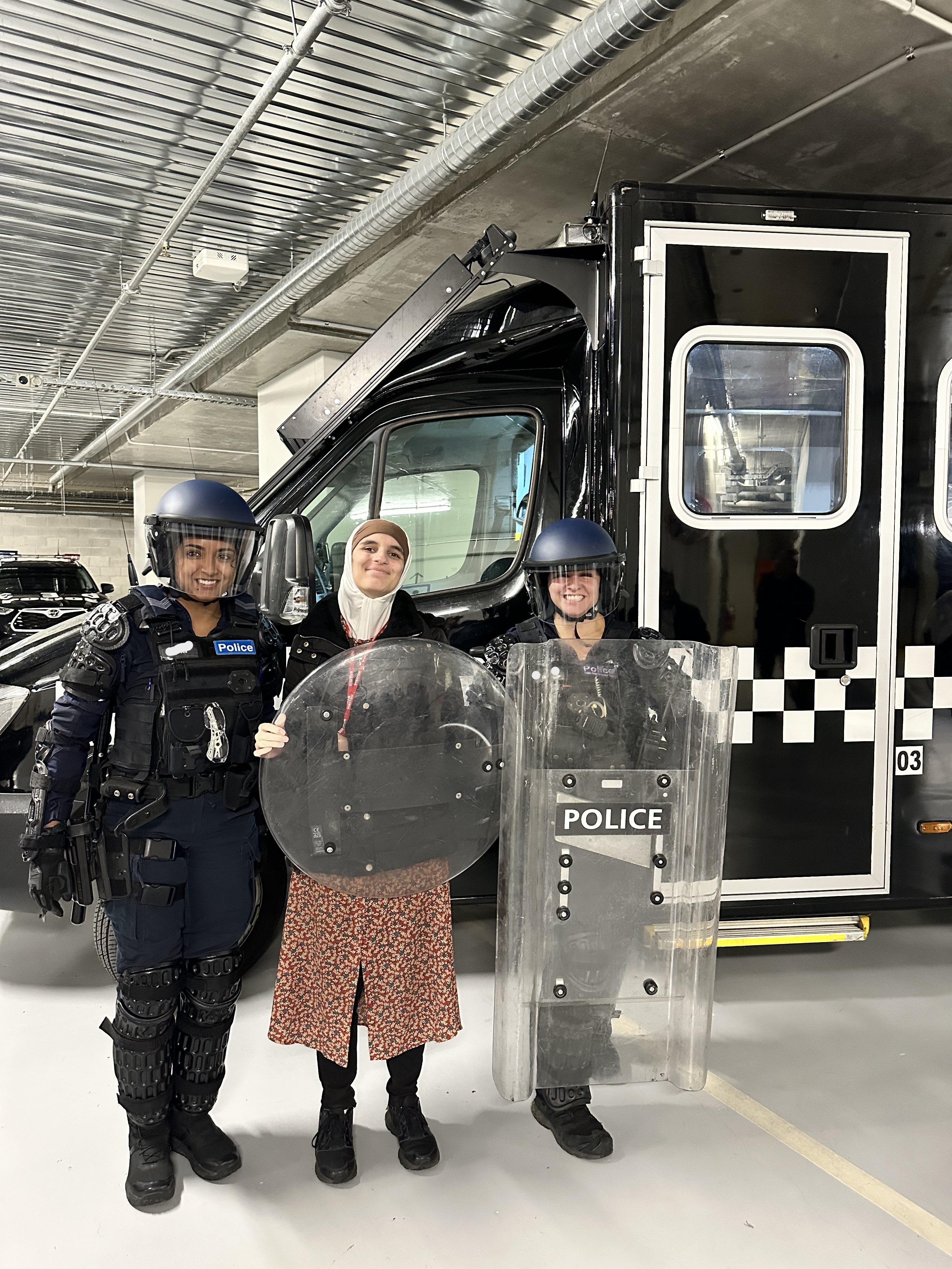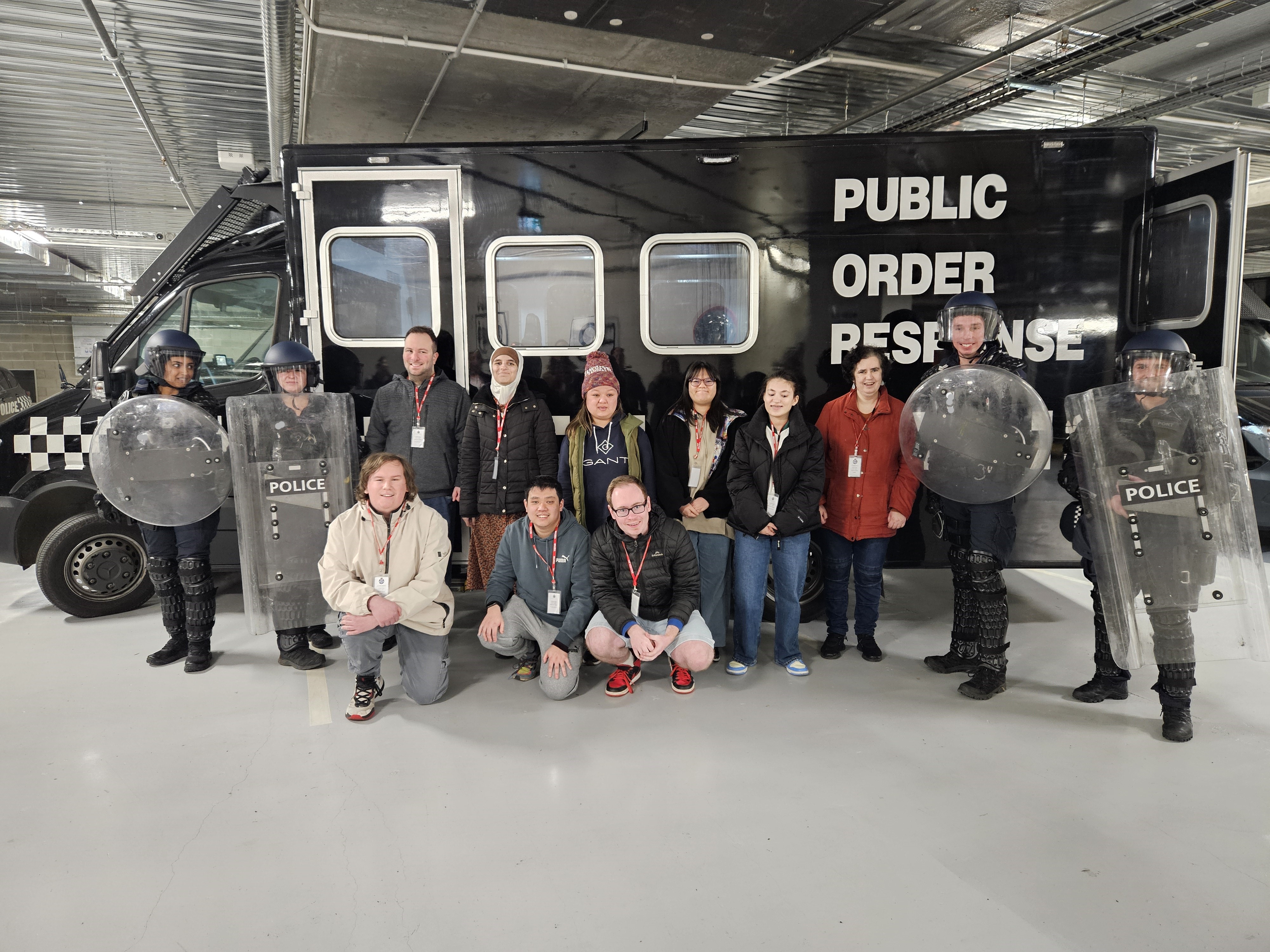 The first stop set the tone for the day – meeting members of the Public Order Response Team (PORT). Participants got an up-close look at the specialised combat gear and impressive vehicles used during public order incidents. Everyone had the chance to feel the weight of the uniforms, try on some of the gear, and even hold the shields – sparking comments about feeling like Captain America!