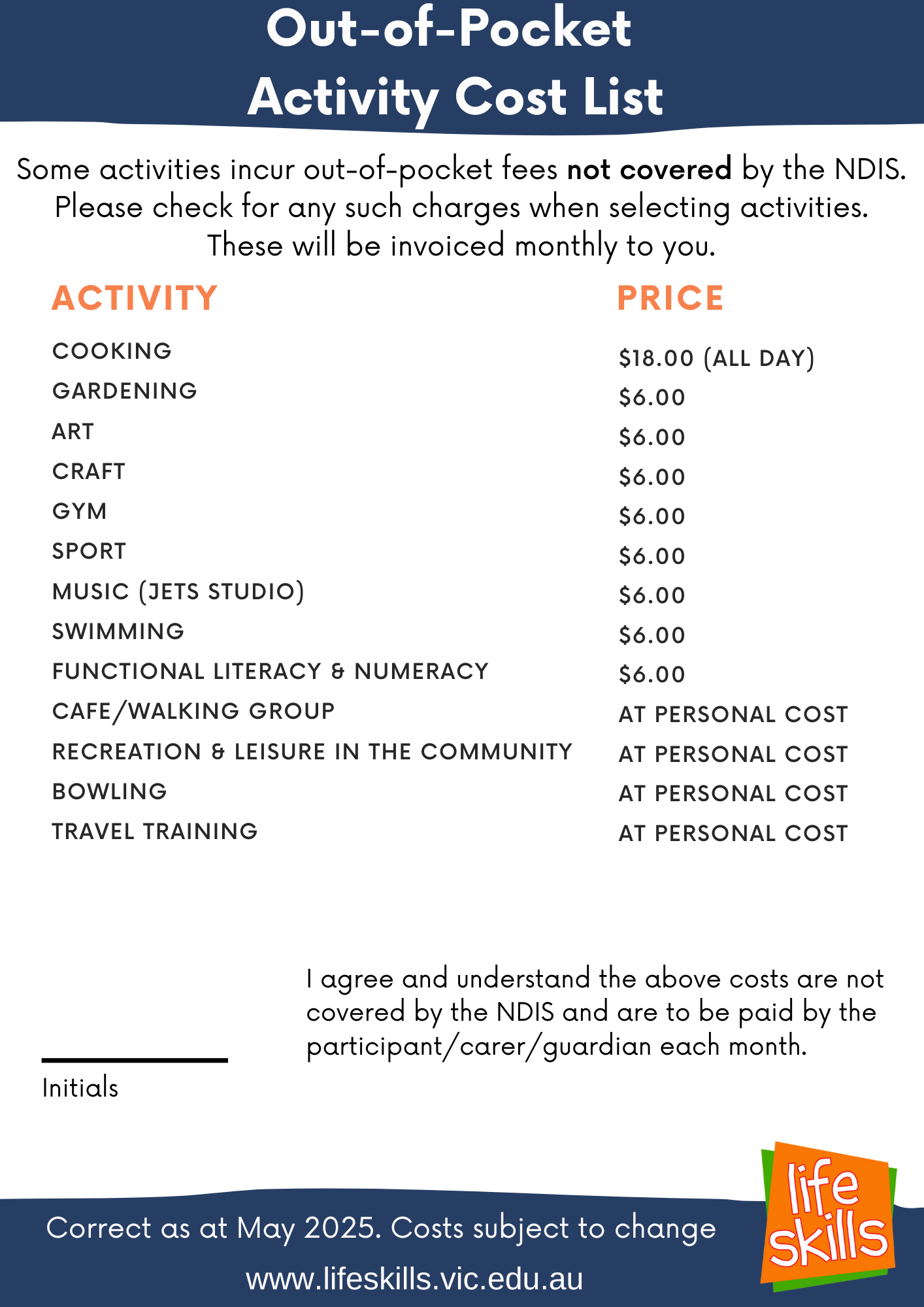 Activity Costs are out-of-pocket expenses that are not covered by the NDIS. Prices are influenced by what it costs to source and supply materials and venues. Lifeskills subsidises the costs of your activities rather than passing them on in full.
