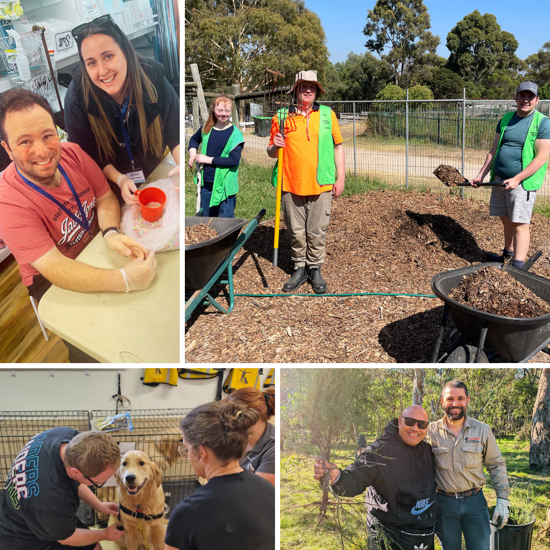 As part of their NDIS-funded activities and support, many participants at Latrobe Lifeskills engage in volunteer work across a range of community organisations. With support from Participant Support Workers, they contribute to settings such as Helping Hands Op Shop, Bundoora Park Farm, Dogs for Life, and the Nangak Tamboree Wildlife Sanctuary.